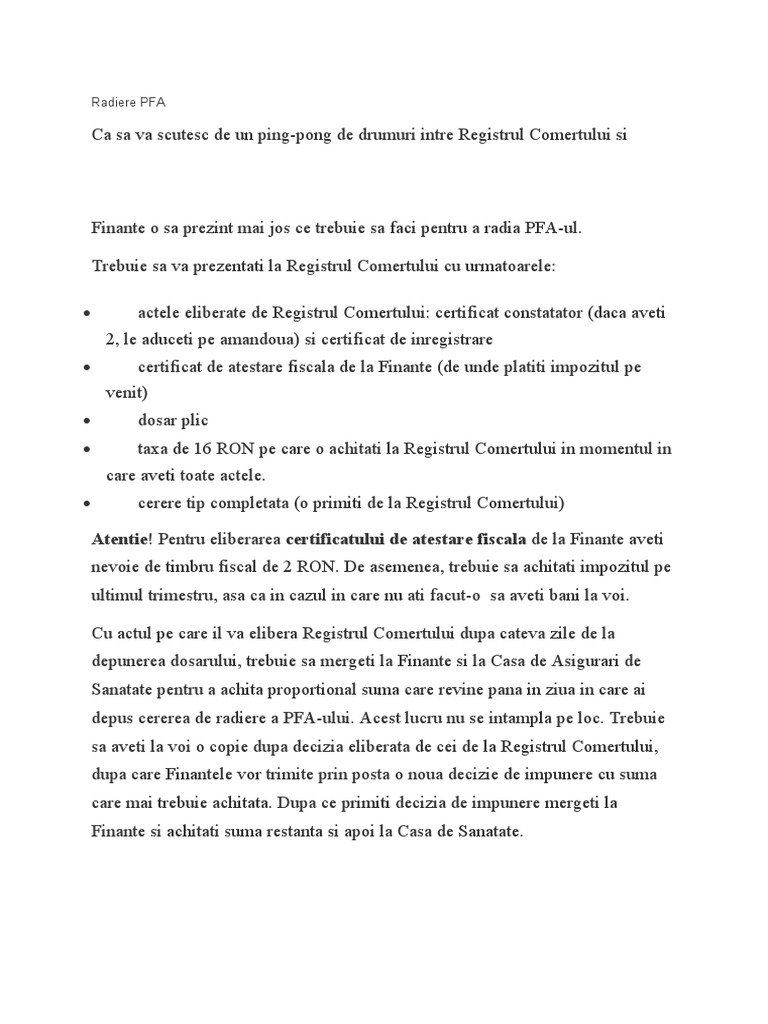 Cerere radiere pfa formular specific registrul comertului. 0722 236 175 luni vineri intre orele 10 18. Acum am fost la camera comertului si l am radiat incepand cu data de 21 03 2018. Buna ziua am un pfa infiintat in 2010.