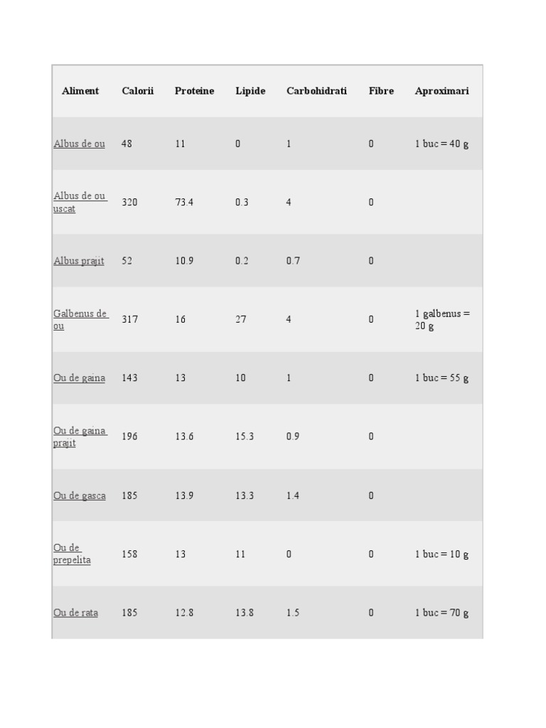 Un albus de ou contine doar 16 calorii iar daca mananci dimineata 4 albusuri de ou primesti 16 grame de proteine pure absorbite de muschi in proportie 100. 16 17 calorii 0 1 g grasime 0 g grasimi saturate 0 g colesterol 55 mg sodiu 0 2 g carbohidrati. Toate valorile nutritive sunt calculate pentru o cantitate de 100 g. Aceste simptome apar de obicei la 6 48 de ore după expunere şi ar putea dura de la 3 până la 7 zile.
