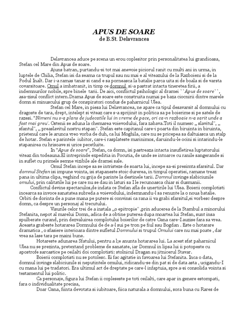Două comentarii de aproximativ o pagină și jumătate la povestirea apus de soare parte din trilogia moldovei care prezintă într o gradaţie ascendentă evoluţia unui conflict politic între domnul autoritar şi câţiva boieri care plănuiesc încălcarea hotărârilor testamentale ale lui ştefan cel mare. Apus de soare comentariu de barbu stefanescu delavrancea barbu stefanescu delavrancea apus de soare accentuarea interesului pentru trecutul national sub influenta ideologiei pasoptiste conduce si in domeniul dramaturgiei la depasirea unor etape a cautarilor reprezentate de incercarile lui gh.