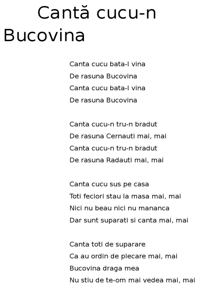 Canta cucul in bucovina. De rasuna bucovina canta cucu bata l vina de rasuna bucovina canta cucu n tru n bradut de rasuna cernauti mai mai canta cucu n tru n bradut de rasuna radauti mai mai canta cucu sus pe casa toti feciori stau la masa mai mai nici nu beau nici nu mananca dar sunt suparati si canta mai mai canta toti de suparare ca au ordin de plecare mai mai bucovina draga mea. Puțini probabil au auzit de constantin mandicevschi autorul cuvintelor acestui imn al românilor din bucovina. Grigore lese canta cucul bata l vina karaoke super stars toate drepturile sunt rezervate. Enjoy the videos and music you love upload original content and share it all with friends family and the world on youtube.