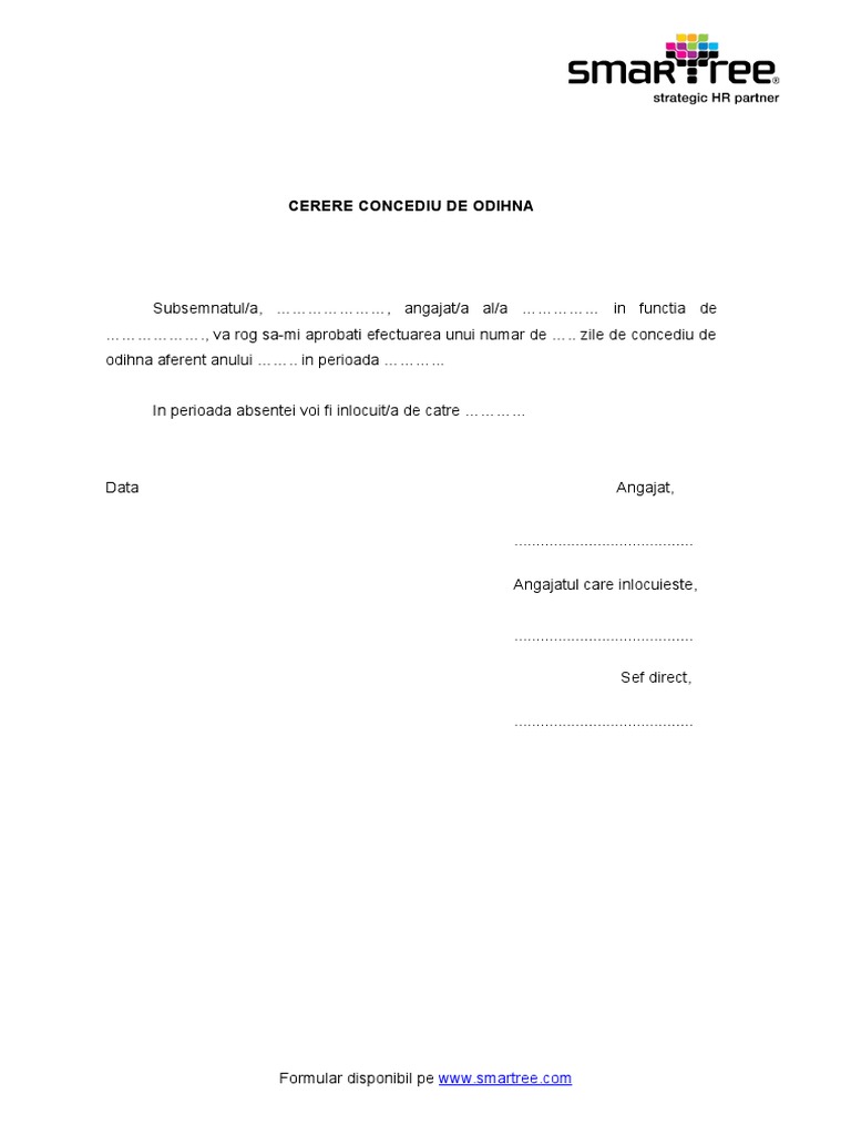 Acest site foloseste cookie uri conform noului regulament de protectie a datelor gdpr pentru a va asigura cea mai buna experienta online in esenta cookie urile ne ajuta sa imbunatatim continutul de pe site oferindu va dvs cititorul o experienta online personalizata si mult mai rapida. Download model de cerere concediu download formular model de cerere concediu in format pdf word doc. Cerere concediu odihna there is document cerere concediu odihna available here for reading and downloading. O poti tipari si completa de mana sau o completezi pe calculator si o imprimi.