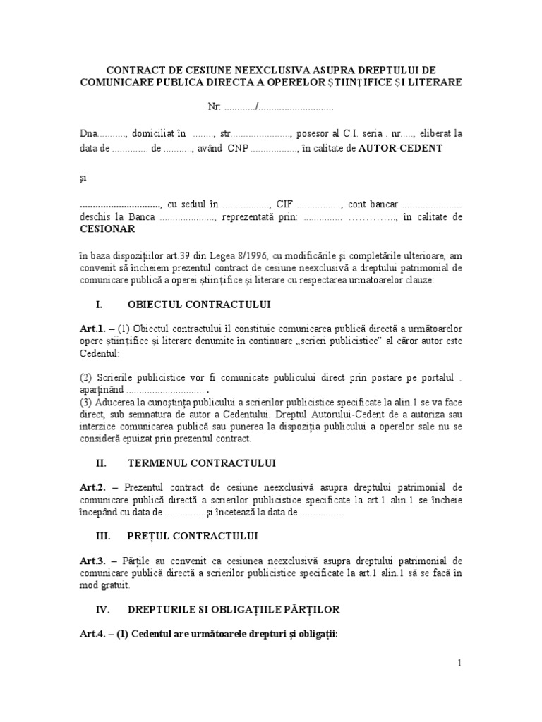 Contract de cesiune drepturi de autor de la angajat catre angajator. Cesionarul poate utiliza lucrarile si se poate bucura de drepturile de autor dobandite prin prezentul contract pe orice teritoriu si in orice limba indiferent de modalitatea de existenta a drepturilor de autor si indiferent de suportii pe care sunt inserate lucrarile. Modele de contracte de cesiune contract de cesiune contract de cesiune a drepturilor patrimoniale de autor contract de cesiune de parti sociale contract de cesiune de parti sociale 2 contract de concesiune contract de concesiune 2 contract de concesiune 3 contract de concesiune comerciala contract de concesiune exclusiva. In calitate de autor titularul dreptului de autor pe de alta parte au convenit sa incheie prezentul contract de editare cu respectarea urmatoarelor clauze.