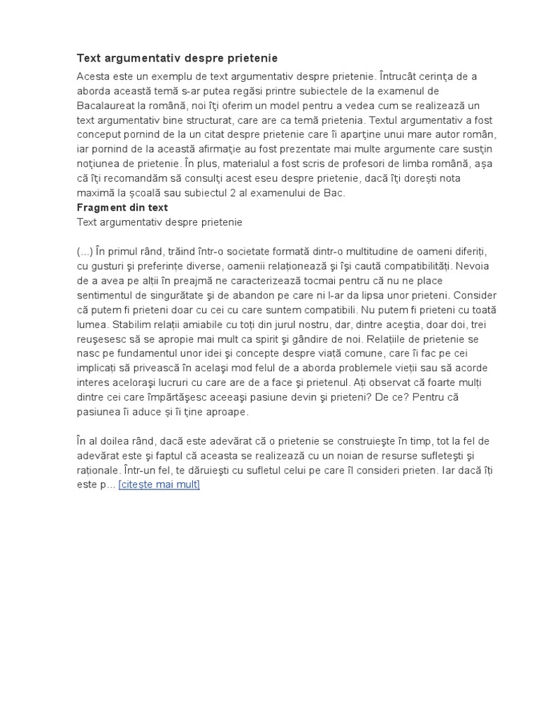 Eseu argumentativ despre prietenie. Mi s a parut ca perspectiva sa este cea mai potrivita. Linkurile finale citesc un text tulburator de o intensitate ce ti taie respiratia semnat de ioana parvulescu. Text argumentativ despre prietenie 2825230 prietenia reprezintă o relație afectivă bazată de respect solidaritate altruism și simpatie care se dezvoltă între oameni. Pentru a lega o relaţie de prietenie nu este suficientă bunăvoinţa.