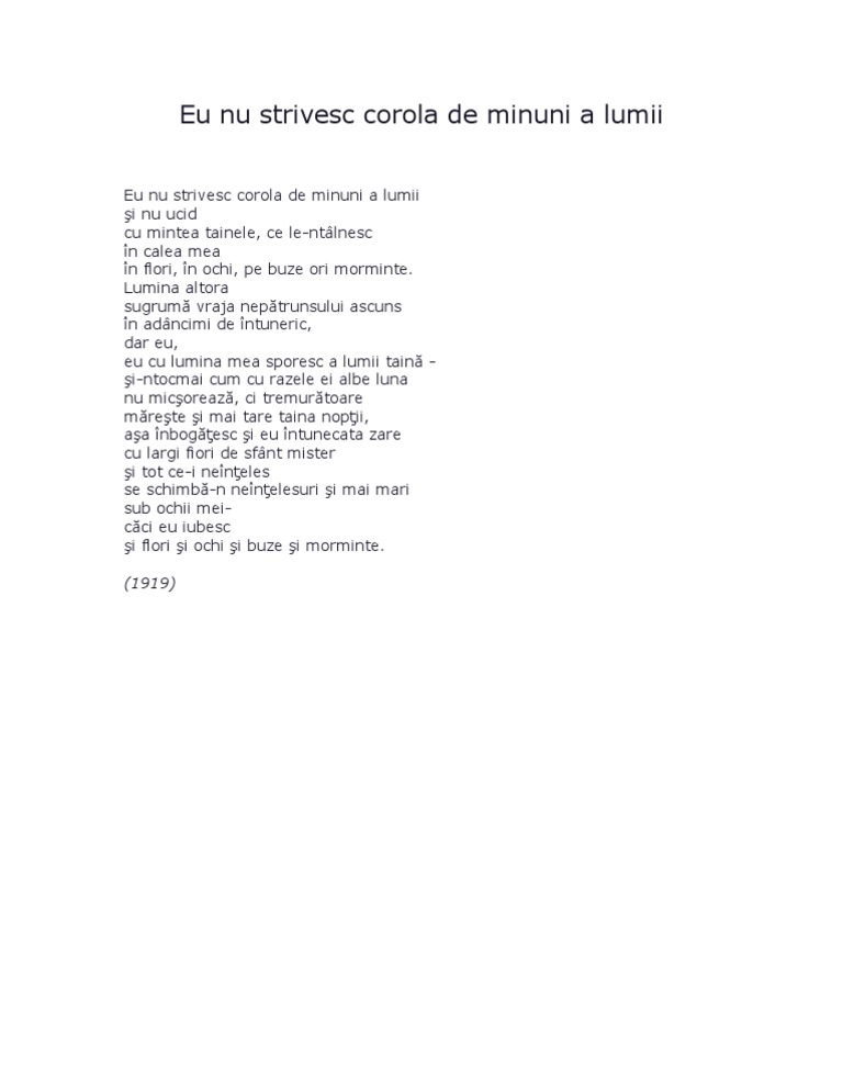 Eu nu strivesc corola de minuni a lumii. Personalitate impunatoare si polivalenta a culturii romane interbelice lucian blaga a marcat perioada respectiva prin elemente de originalitate compatibile cu inscrierea sa la universitate. Poezia eu nu strivesc corola de minuni a lumii deschide volumul de debut poemele luminii 1919 al scriitorului lucian blaga situându l pe acesta încă de la început într o poziţie singulară în peisajul poeziei româneşti interbelice deoarece sunt prezente aici într o formă concentrată toate elementele programului expresionist sentimentul absolutului exacerbarea eului creator elanul vitalist interiorizarea şi spiritualizarea peisajului etc. Lumina altora sugrumă vraja nepătrunsului ascuns în adâncimi de întuneric dar eu eu cu lumina mea sporesc a lumii taină şi ntocmai cum cu razele ei albe luna.