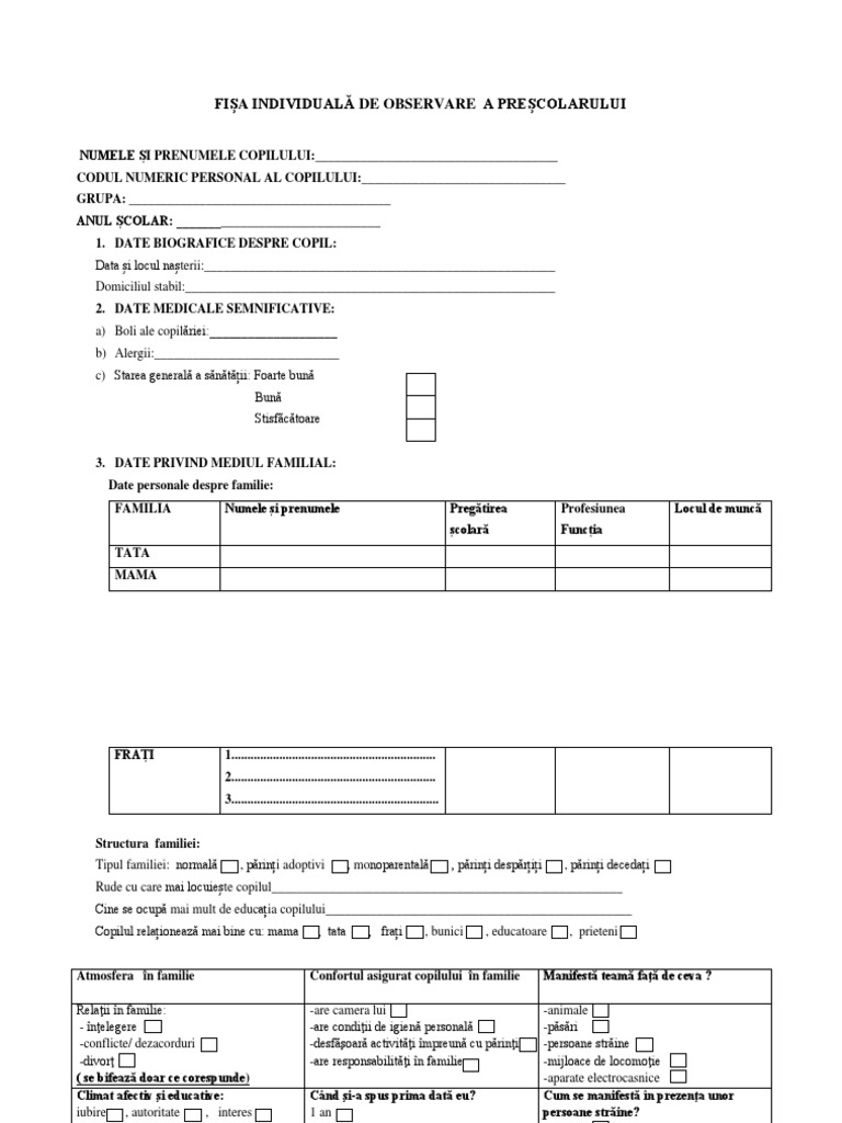 Fişa individuală de observaţii curente. Fișă de observație asupra comportamentului copilului. Observarea copilului in gradinita. 0 stele 0 review uri.