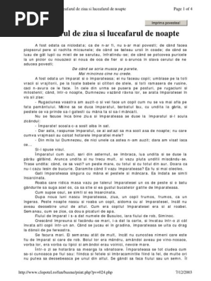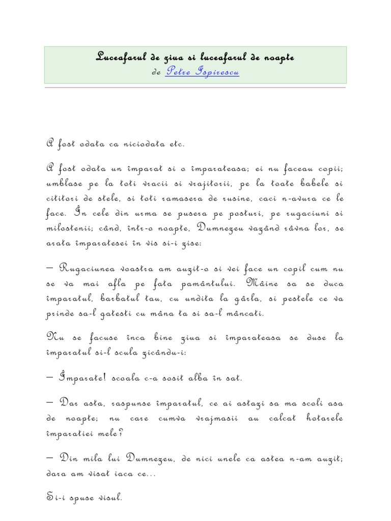 Cum era copilul împărătesei era și al roabei. Numele lui ispirescu este cunoscut în literatura română mai ales datorită efortului depus de către acesta pentru prezervarea creațiilor epice populare pe care le a cules și le a adunat într un singur volum. Cand într o noapte dumnezeu vazand ravna lor se arata împaratesei în vis și i zise. Luceafărul de zi și luceafărul de noapte este o legendă populară culeasă de petre ispirescu.