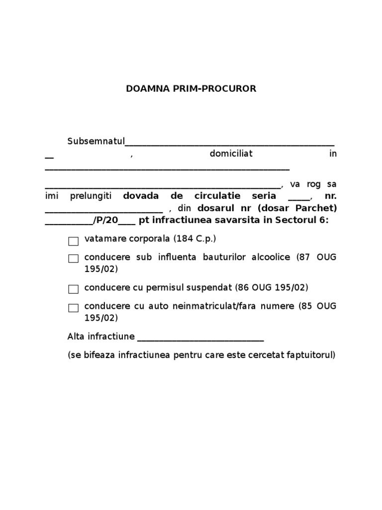 Vreau și eu un model de cerere ptr prelungire dovada circulatie. Prelungire dovada de circulatie caz penal. In situatia in care v a expirat dovada de circulatie in cazurile in care permisul v a fost retinut puteti face cerere pentru prelungirea dovezii pe care o depuneti la parchetul sau instanta care gestioneaza cazul dumneavoastra.
