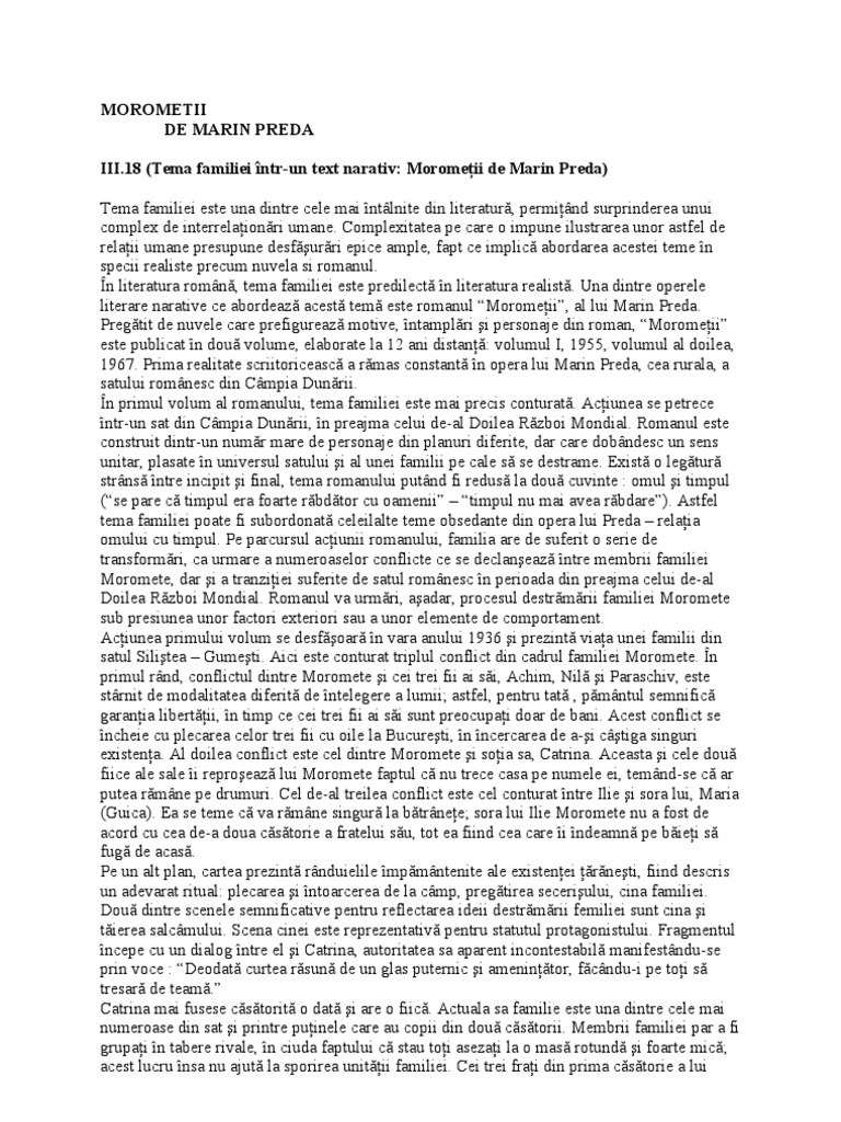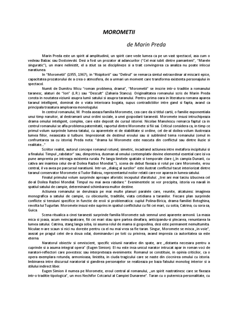 Morometii de marin preda comentariu. Personajele numeroase şi puternic individualizate sunt angrenate în conflicte puternice structura narativă este amplă şi conturează o imagine bogată şi profundă a vieţii a satului românesc de unde reiese şi trăsătura de roman realist. Romanul moromeţii de marin preda este o specie a genului epic în proză de mare întindere cu acţiune complexă şi complicată desfăşurată pe mat multe planuri narative care se intersectează şi cu o intrigă complicată. Romanul moromeţii ia naştere în urma unui îndelung proces de elaborare. în următorul volum această viziune va fi dominantă.