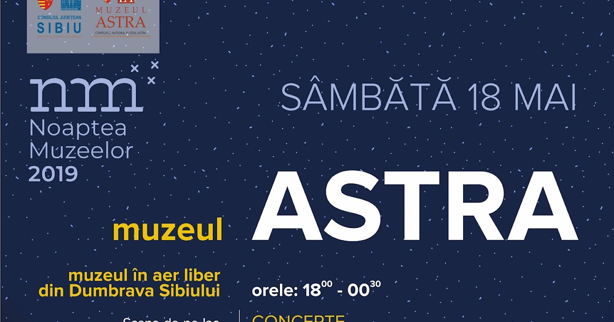 în 2019 noaptea astra propune un program bogat la complexul național muzeal astra sibiu. Peste 1 000 de vizitatori in primele ore. In cadrul proiectului noaptea muzeelor 2019 muzeul astra a organizat caravana noaptea muzeelor un tur cu ghid pe traseul sibiu sura mare ocna sibiului apoldu de sus miercurea sibiului noul roman. In romania evenimentul este organizat de catre reteaua nationala a muzeelor din romania membru in conducerea celei mai mari retele pan europene a muzeelor network of european museum.