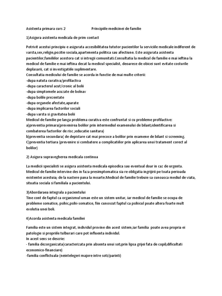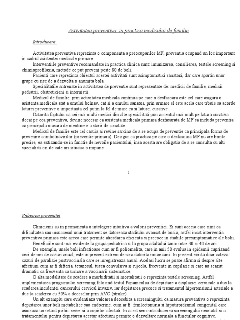 Preventia primara a bolilor in medicina de familie. In cazul bolilor cronice medicul de familie sintetizeaza situatia pacientului cu integrarea afectiunilor acestuia in contextul vietii si activitatii individului respectiv cu rol in indrumarea si etapizarea actiunilor necesare in functie de afectiune. De asemenea este în derulare testarea aplicabilit ății la nivelul a 100 de cabinete de medicină de familie din 4 zone ale țării bucurești ilfov dolj cluj iași a recomandărilor formulate. Experiențele de 2 3 decenii de aplicare a unor programe serioase de prevenție au dovedit deja acest lucru. Medicina de familie asigura tratamentul bolilor acute la prezentare si are rol in preventia recidivelor sau a raspandirii unor boli infecto contagioase.
