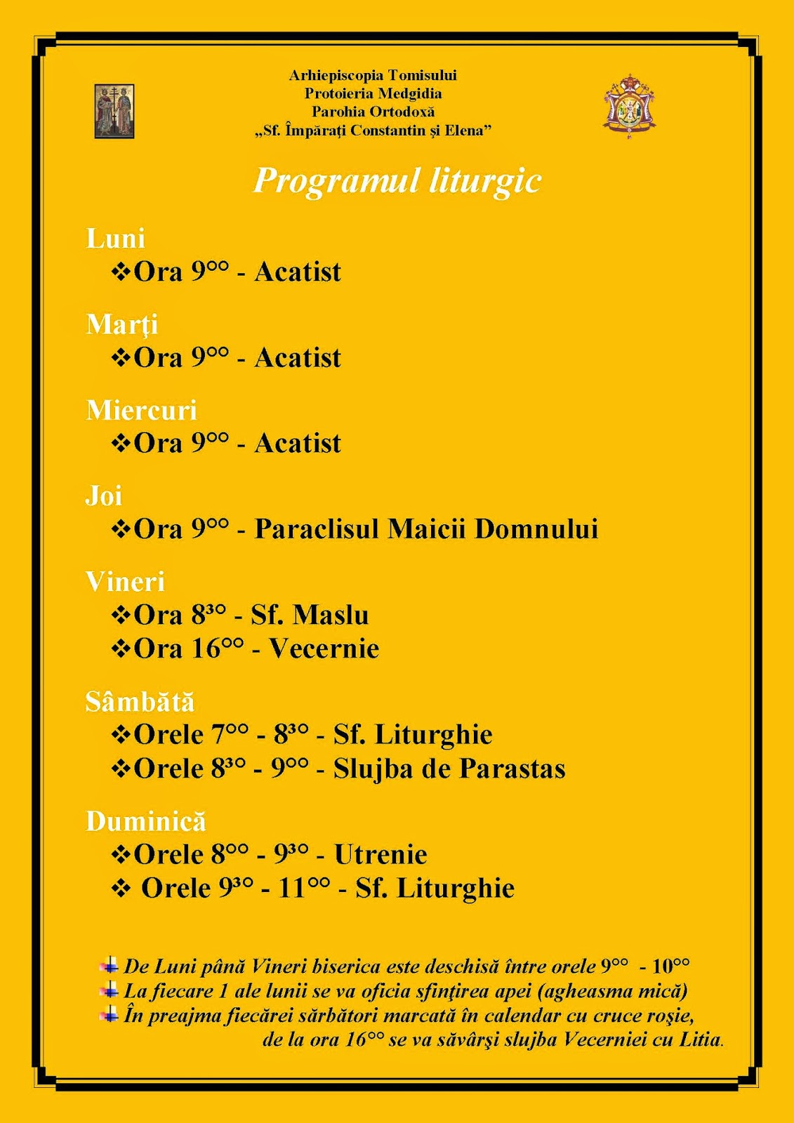 Program slujbe biserica ortodoxa. Programul sfintelor slujbe în luna septembrie în anul domnului 2020. Octombrie 11 octombrie duminica nu se savarseste sfanta liturghie 18 octombrie duminica 09 30 acatistul domnului nostru iisus hristos 10 00 sfânta și dumnezeiasca liturghie 24 octombrie duminica 09 30 acatistul domnului nostru iisus hristos 10 00 sfânta și dumnezeiasca liturghie reguli generale pentru reluarea slujbelor in parohia sf. Program slujbe în luna iulie 2019 nu se vor săvârși slujbe în parohia ort. Mihail și gavriil din berlin ul de vest.