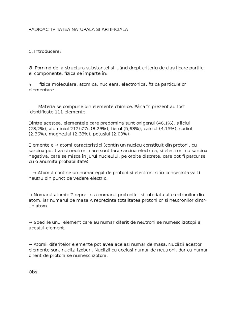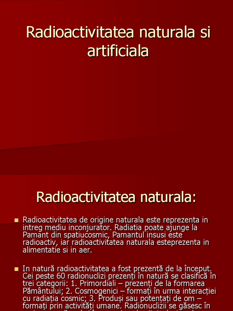 Radioactivitatea artificială apărută mai ales după descoperirea fisiunii nucleare în anul 1939 a dus rapid la implicaţii şi consecinţe uluitoare pentru omenire. Radioactivitatea naturala si artificiala. Proiectul radioactivitate naturala si artificiala fizica pentru facultate uploadat in biblioteca regielive id 102258. Radioactivitatea de origine naturala radiatia cosmica radiatii gamma terestre produsele de dezintegrare ale radonului radioactivitatea alimentelor doza totale 4.